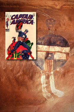 The exhibition begins with a photograph of a cartoon from the 13th century. The image of the red, white and blue pictograph of the All American Man, a shield carrying warrior from the Pueblo II period (carbon dated to ca. 1290) will be contrasted to a drawing of that other red, white and blue shield hurling hero, Captain America. The most recent works will be from 2008. The majority of Indian art will be from 1990 to the present day.